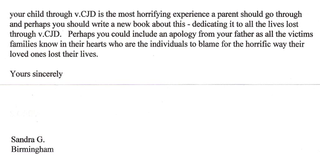 One of the letters to Benedict Gummer below was written by a heartbroken mum Sandra from Birmingham who lost her 28 year old son to vCJD…..….