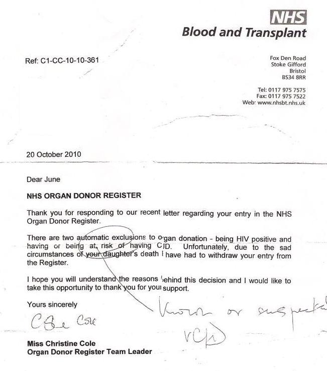 However later I was told by another expert ‘off the record’ that even if parents and siblings of vCJD victims are accept on the organ donor registrar, it’s when the organs are retrieved that an ‘at risk’ status might be decided. If this is the case the organs would not be used for transplantation, if this happened the organs could be used for research…...