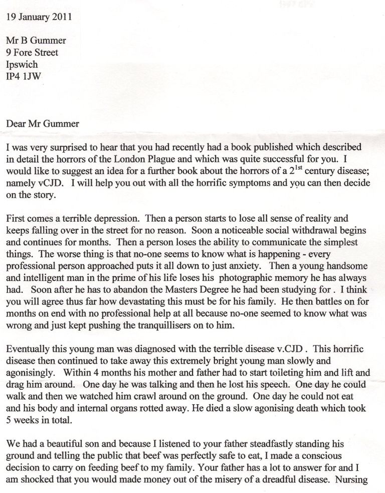 One of the letters to Benedict Gummer below was written by a heartbroken mum Sandra from Birmingham who lost her 28 year old son to vCJD…..….